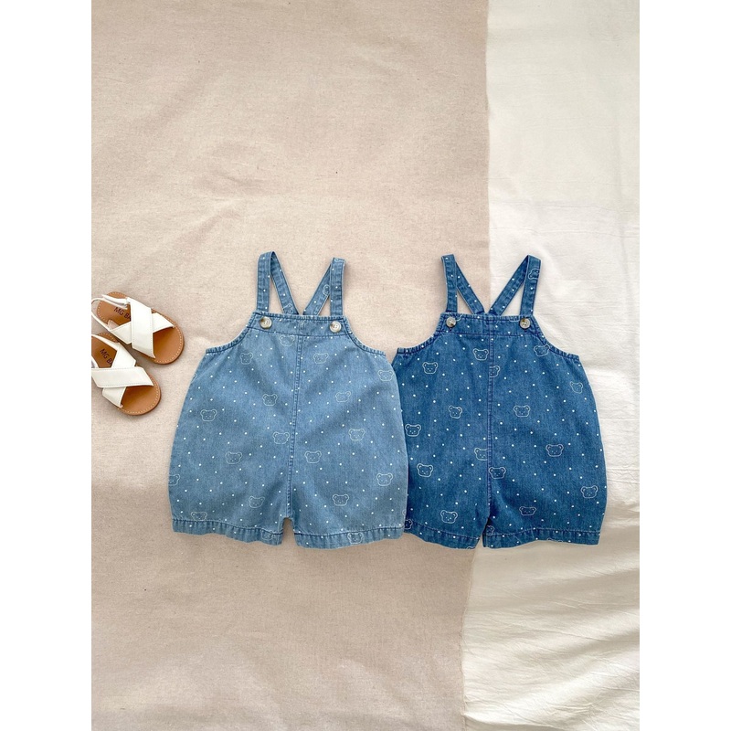Get your little one ready for sunny adventures with these playful denim overalls! Featuring a cute teddy print and cheerful white dots, these unisex summer overalls combine comfort and style perfectly. Lightweight and durable, they let your child move free
