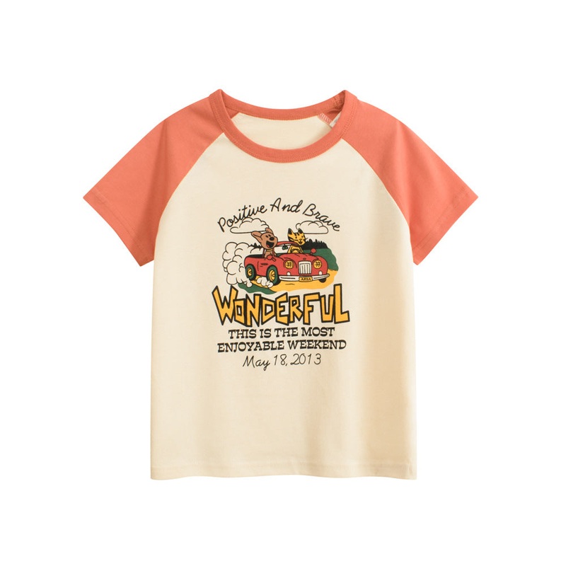 This Summer Boys T-shirt features a refined blend of cartoon and letter prints combined with vibrant color patchwork, embodying a contemporary European and American aesthetic. Crafted for comfort and style, it offers a distinctive look that elevates casual