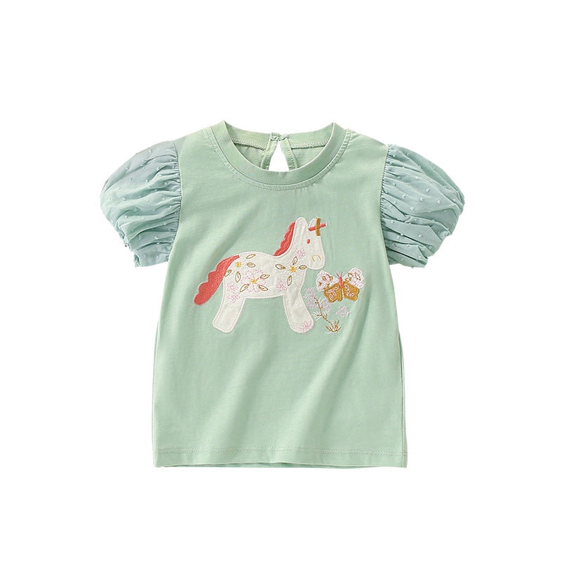This Summer Girls T-shirt features a charming pony and floral pattern inspired by European and American styles. Crafted for comfort and style, it offers a refined look perfect for warm days. The delicate design adds a touch of elegance to casual wear, maki