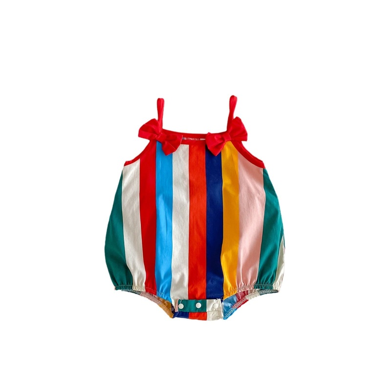 Vibrant Rainbow Stripes: Colorful and fun stripes add a joyful pop to your baby girls summer wardrobe. Cute Bow Strap Details: Adorable bows on the straps enhance the playful design. Sleeveless & Lightweight: Keeps your baby cool and comfy during warm days