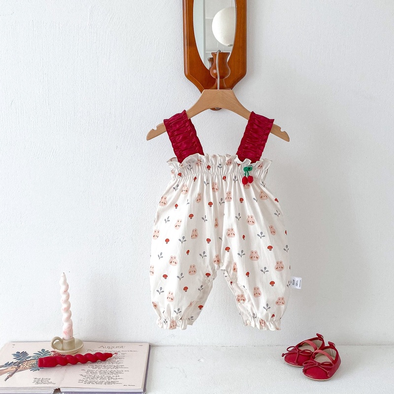 Adorable Rabbits Print: Fun and sweet bunny pattern perfect for little girls summer wardrobe. Sleeveless Pleated Strap Romper: Lightweight design with stylish pleats for comfort and ease of movement. Breathable & Soft Fabric: Keeps your baby cool and comfy
