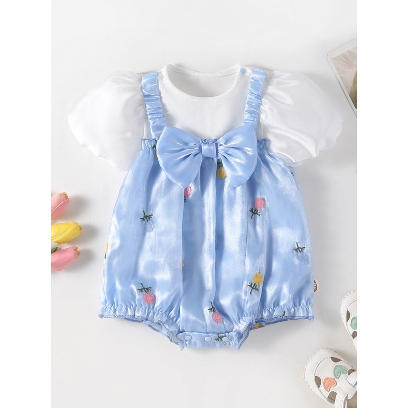 Charming Floral Pattern: Bright and pretty flowers add a sweet, summery vibe. Statement Big Bow: Eye-catching bow detail adds a fun and adorable touch. Short Sleeves for Warmth & Comfort: Lightweight fabric keeps your baby cool and comfy. Easy Onesie Style