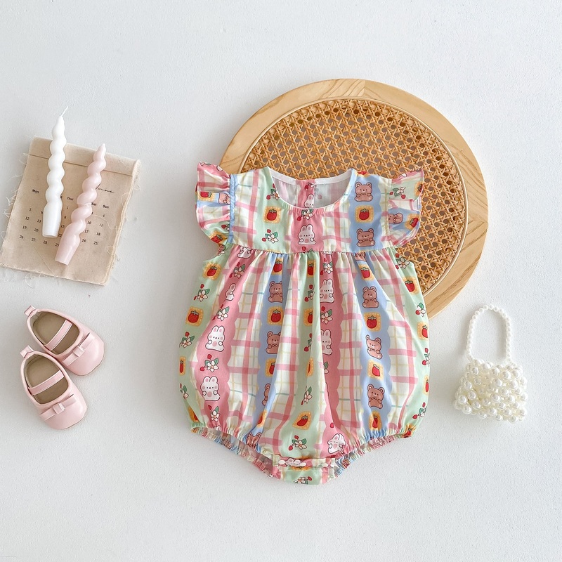GWIL528535640Summer New Arrival Baby Girls Rabbits Print Plaid Fly Sleeves Crew Neck Onesies