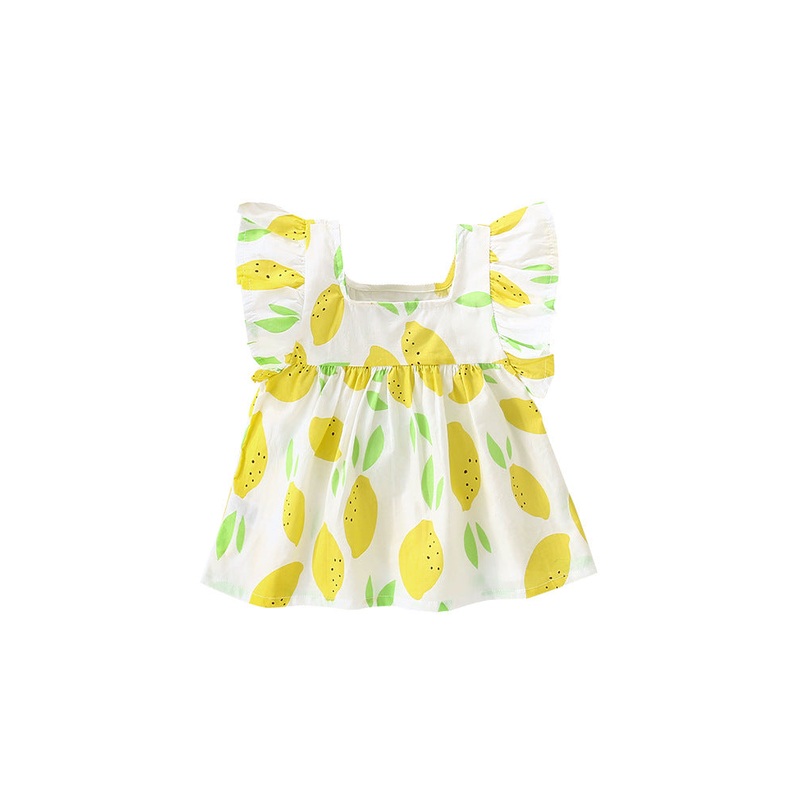 Brighten up sunny days with this adorable lemon-patterned dress designed for little girls. Featuring playful fly sleeves and a charming square neckline, it offers a breezy and comfortable fit perfect for summer adventures. Let your little one enjoy both st