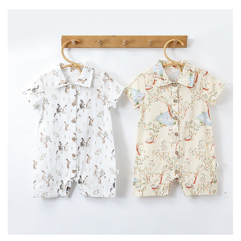 Keep your little one cool and comfy this summer with these adorable unisex rompers! Featuring short sleeves and a charming turn-down collar, theyre perfect for endless playdays and sunny adventures. Made with breathable fabric, these rompers make hot days