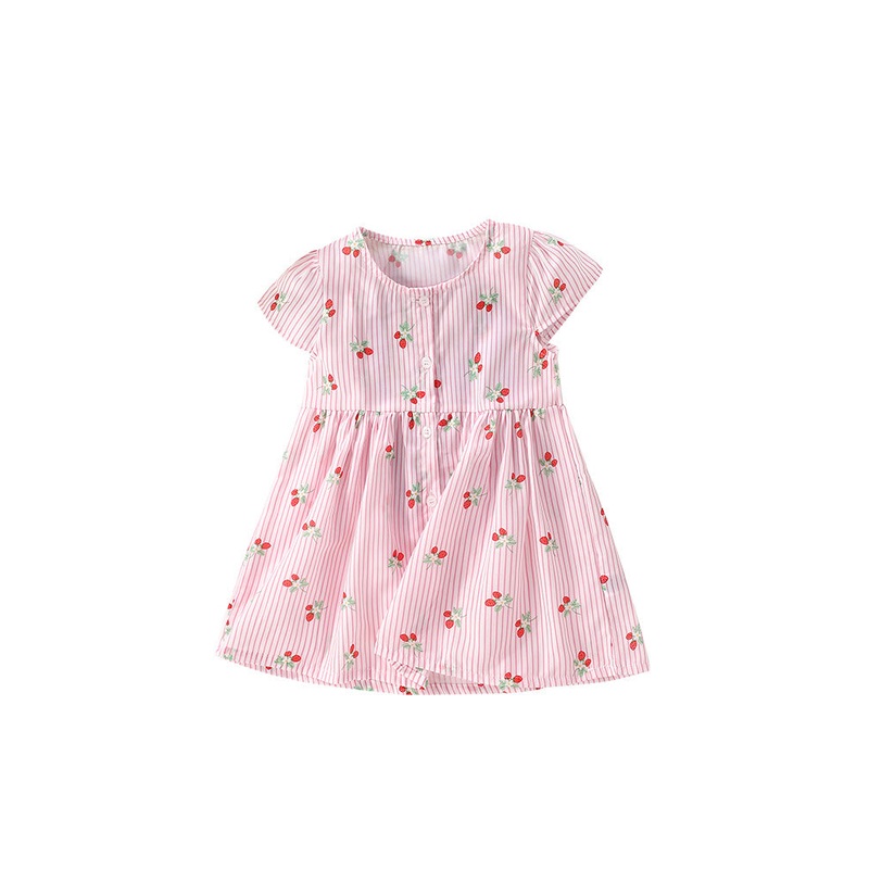 GWIL528535895Summer New Arrival Girls Strawberry Pattern Striped Single Breasted Short Sleeves Round Neck Dress