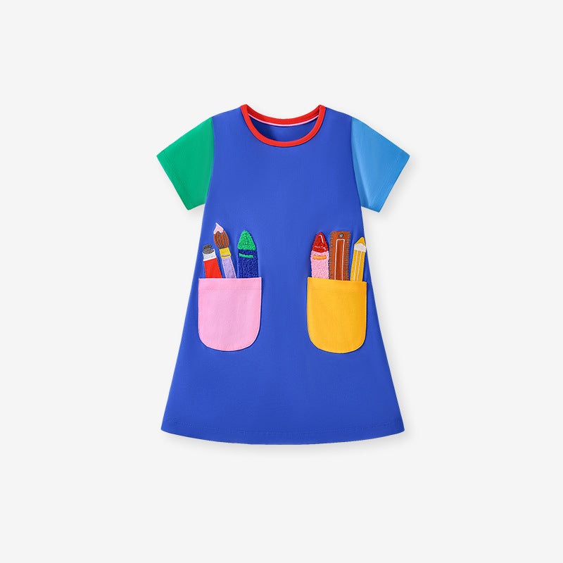 This playful summer dress features a fun pencils pattern and short sleeves, perfect for keeping stylish girls cool and comfortable. With handy pockets for little treasures, its an ideal choice for sunny days filled with adventure and creativity.