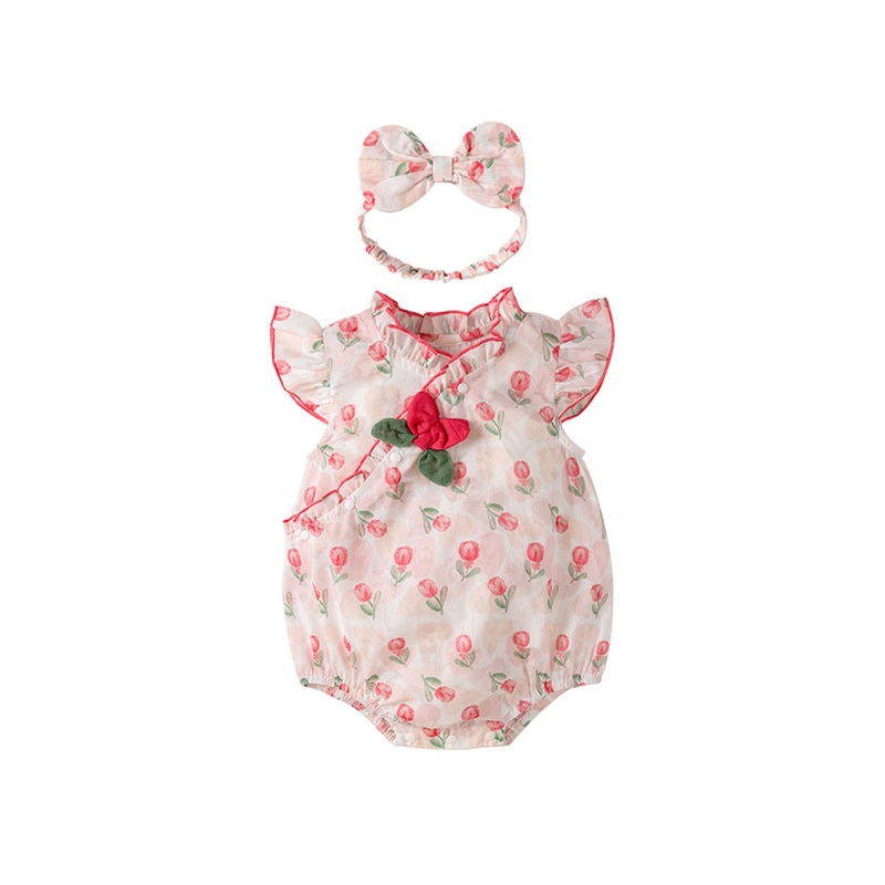 Dress your little one in charming summer style with this adorable baby girl onesie. Featuring a vibrant red rose floral pattern, delicate fly sleeves, and a sweet ruffle neckline, its designed for comfort and cuteness. Perfect for warm days, this onesie ke