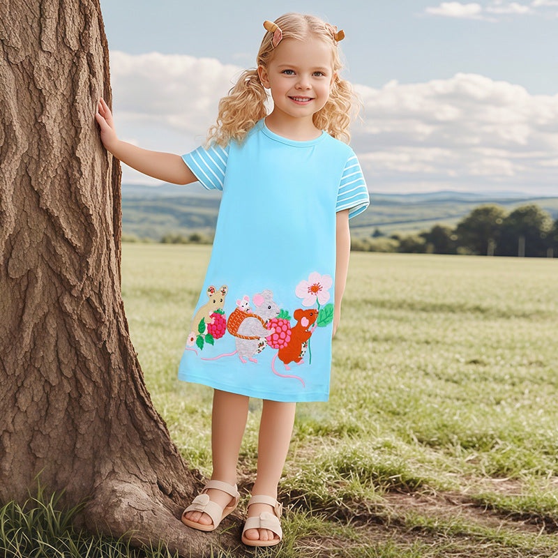 GWIL528538196Summer Pure Cotton Animals Cartoon Pattern Short Sleeves Dress for Stylish Girls