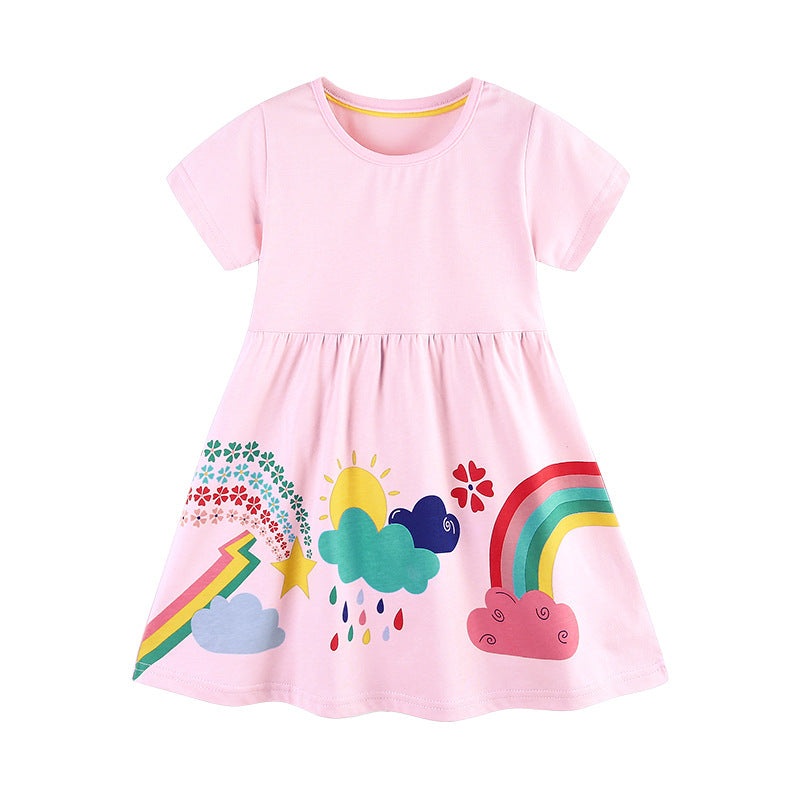 GWIL528538173Summer Pure Cotton Colorful Rainbow Pattern Short Sleeves Pink Dress for Stylish Girls