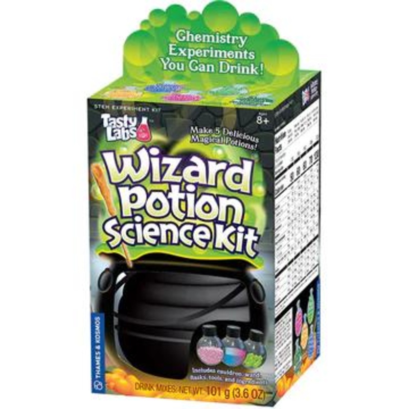 Brew up a cauldron of sweet, magical potions that you can actually drink. Follow the illustrated story of two young wizards-in-training, Randolph and Zelinda, as they mix up a series of magic potions and discover real scientific phenomena in the process! Make five different potions including a fizzing citrus elixir, strawberry frogs eggs, a color-changing transmogrification potion, a slimy chia seed drink, and an anti-gravity tonic. Learn basic chemistry lessons from each potion, covering topics including chemical reactions, polymers, solutions, suspensions, indicators, mixtures, and density. For Ages 8 and up. WARNING: CHOKING HAZARD – Small Parts. Not for children under 3yrs.