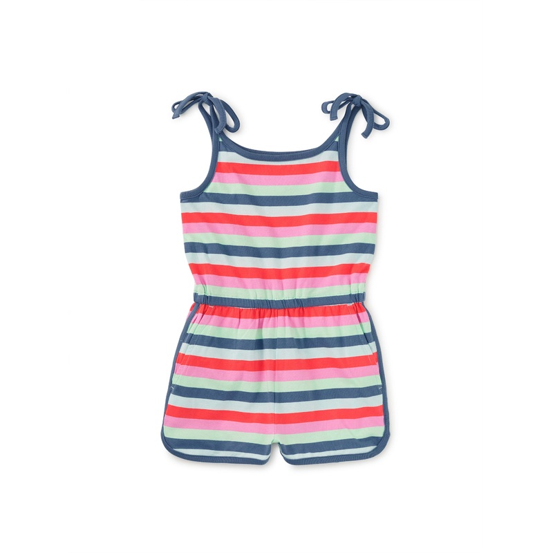 A vintage-inspired favorite with a sporty twist! This easy-fit romper features adjustable tie shoulders, contrast piping, and a dolphin hem for a fun, throwback look. Slash pockets and an elastic waist add all-day comfort, while the 100% cotton jersey fabric keeps it soft and breathable for warm-weather adventures.