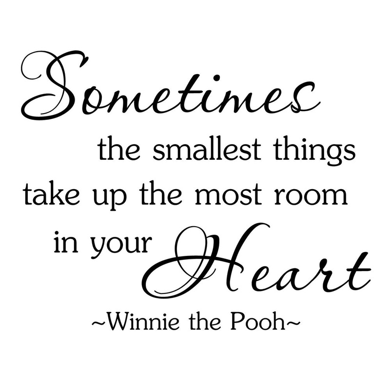 This wall decal makes the perfect decoration for a nursery or child's bedroom. In multi-font black lettering, it says, "Sometimes the smallest things take up the most room in you heart. Winnie the Pooh." You will find the saying to be very true about your