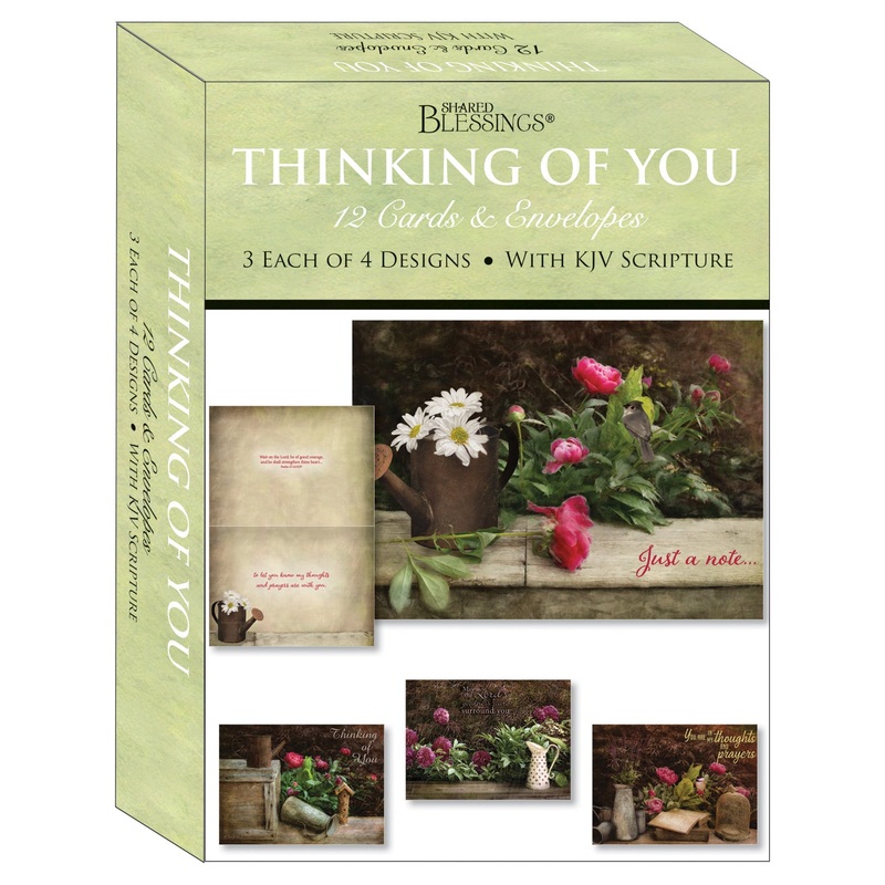 Send love across the miles with a Thinking of You Florally Yours Boxed Cards SBEG22355 from Shared Blessings. Perfect for almost any occasion, these beautiful cards each have a fitting KJV scripture inside. 12 Cards & Envelopes3 Cards Each of 4 DesignsThin