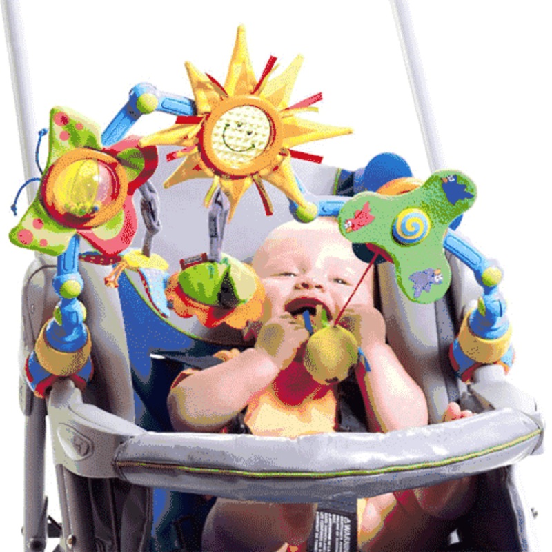 Baby activated propeller Transparent sun prism Rattling butterfly ball with crinkly texture Flower mirror Crinkly butterfly Flexible arch with angle adjustment Easy attachment clips