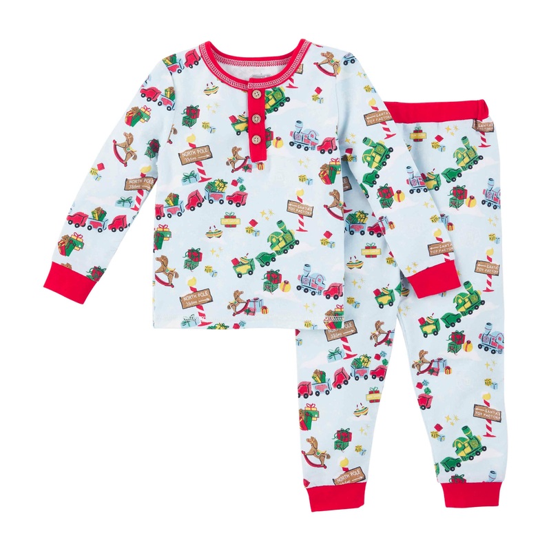 Toyland Blue Pajama 2-piece set from Mud Pie. This cotton spandex long sleeve pajama features a top with red trim and wooden buttons. Comes with pull-on coordinating pants inatoyland print including rocking horses, trains and other traditional Christmas to