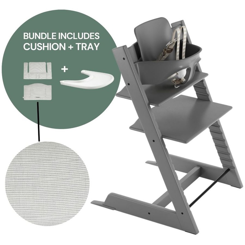 The Tripp Trapp Chair is conveniently offered in a package that also provides a Tripp Trapp Baby Set with harness and gliders, plus a Tripp Trapp Classic Cushion and Tray. When used together, these items make a standalone high chair, which safely and ergon