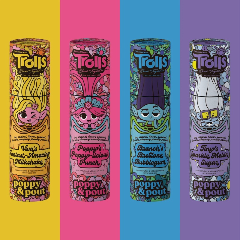 Your favorite Trolls characters are dancing to life this fall with their very own Poppy & Pout vegan lip balm featuring characters from the new movieTrolls Band Together.