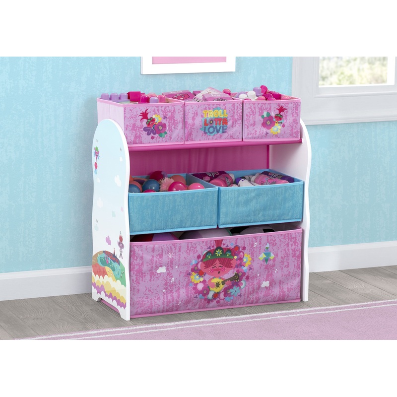 This Trolls World Tour Design and Store 6 Bin Toy Organizer by Delta Children will make you want to sing! Designed for little kids with big imaginations, this cool toy storage bin features colorful graphics of Poppy, Branch, Cooper, Sheila B, Delta Dawn, T