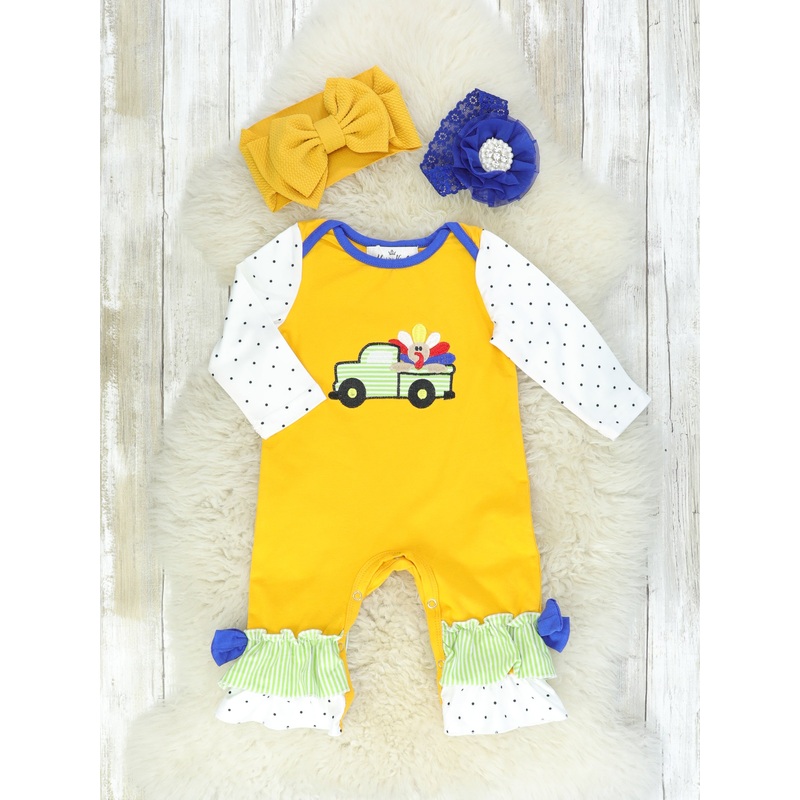 Be the first to review “Turkey Truck Mustard Ruffle Romper”