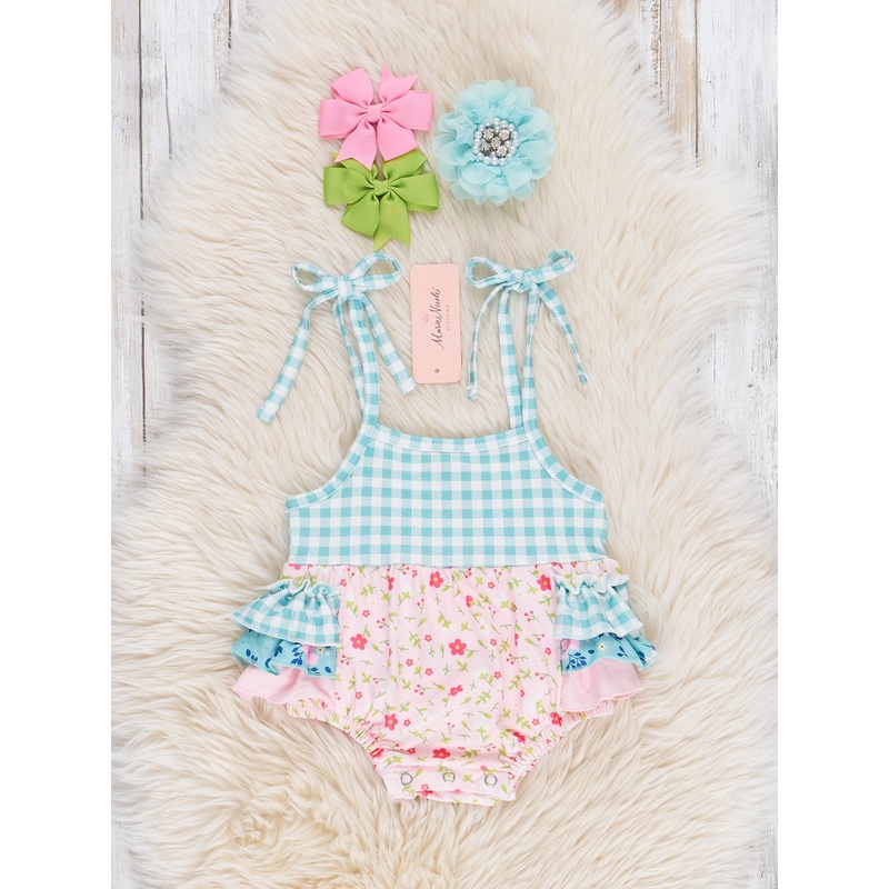 Make a statement with our Turquoise Gingham & Pink Florals Ruffle Bubble! This playful and summery bubble is perfect for girls and comes with a matching sister set. With trendy tie straps and a unique mixed print, this ruffle butt bubble from is sure to ma