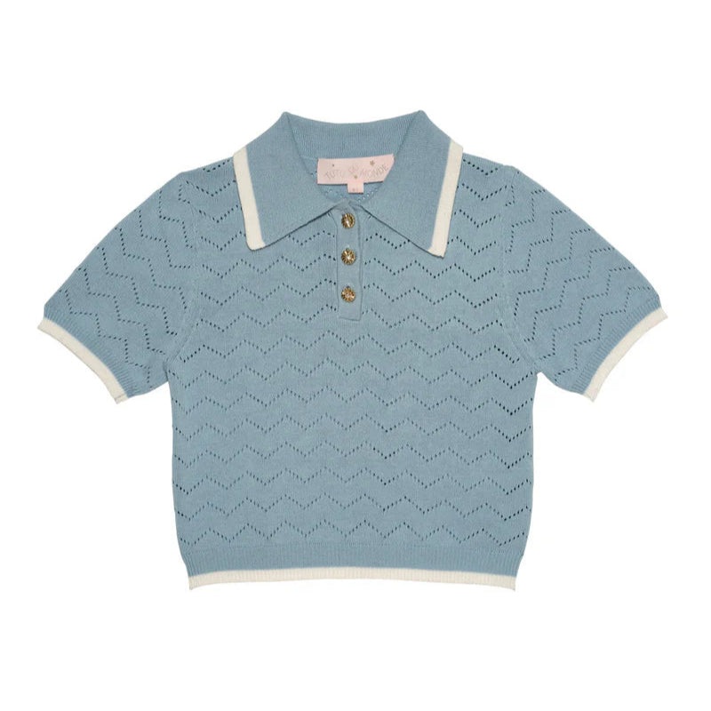embrace timeless elegance with the tutu du monde chelsea knitted top in canal blue. crafted from soft pointelle knit, it features a wave pattern that adds texture and depth. the gold flower buttons create a playful yet elegant accent, while the classic collar gives the top a polished, vintage feel.