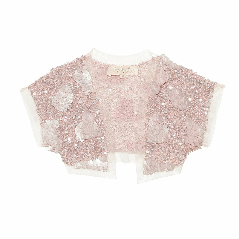 razzle dazzle them with tutu du mondeglitzy queen b shrug! the fine tulle cape is fully embellished with tiny silver, pewter and pink sugar sequins and glistening metallic discs, making it a real showstopper. featuring short sleeves with a transparent tull