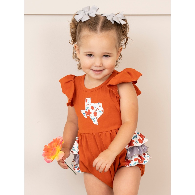 Score an instant win with thisTX Burnt OrangeSibling Set! Perfect for game-day support or just a morning playdate, this bubbleis sure to help theTexas fans in your fam show off their state pride with delightfulTexas Burnt Orangefloral ruffles and embroidered state design.