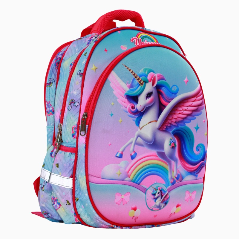 A cheerful companion for any school day, this light blue unicorn backpack combines comfort and creativity.Whimsical design with spacious compartmentsErgonomic padded straps for growing shouldersLightweight material thats easy to cleanIdeal for longer schoo