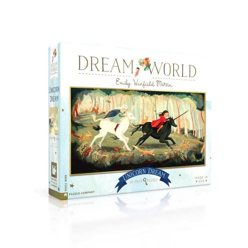 Riding through the castle’s bountiful woods with critters along side, the children gallop atop their magical unicorns. Dream World Illustration by Artist Emily Winfield Martin. For ages 5 and up. WARNING: CHOKING HAZARD – Small Parts. Not for children under 3yrs.