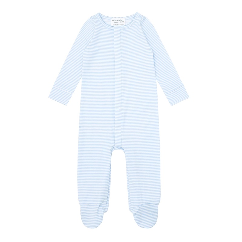 Splish splash! Your little ones can play all day, in and out of the water, in the clean lines, simple details, and fun silhouettes of Minnow Swims resortwear for girls and boys. Cozy, comfy andcute as can be, theUnisex Powder Blue Stripe Pima Footie are just for baby, with asnap closure for easy changes, sweet picot trim detail, and grips on the sole of the feet.The buttery soft pima fabric isideal as your littlest one moves and grows.