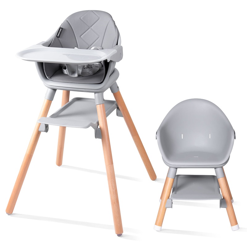 Beberoad Love Baby High Chair, 4 in 1 Wooden Highchair Convertible High Chair Booster Toddler Chair with Double Removable Tray, 5-Point Harness PU Cushion for Babies Infants Toddlers Grey Multifunctional Design: All-new designed baby high chair includes 6