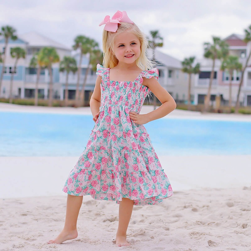 Shop our new matching mom & me collection! The cutest Vintage Rose Willow Dress for all day fun or a special occasion! Featuring angel sleeves, an elastic smocked cheston apink vintage rose print.