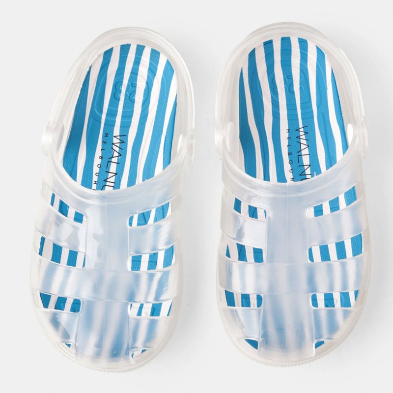 The perfect pool or beach slip-on has to be the new blue Frankie Slide .The light-weight, jelly sandal features a back strap that can also be moved to the front of the shoe so it can be worn as a sandal or slide.Features:Jelly-style plastic shoeWaterproof,