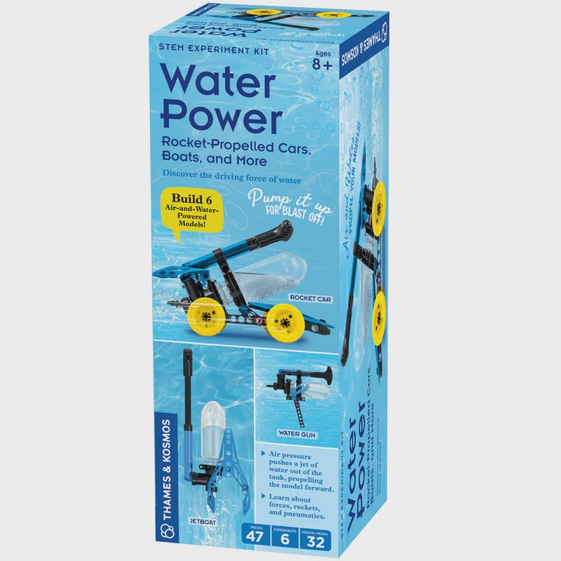 Harness the power of air and water to make things move! Build water-rocket cars, jet-propelled boats, a water gun, and even a lawn sprinkler. Learn about the laws of physics and their applications in real-world engineering. When you pump air into your rocket, you increase the air pressure inside. Then when you release the clamp, watch out the air and water mixture inside will shoot out, causing your rocket to zoom off in the opposite direction! Many machines, from the oldest pipe organs to modern day rocket ships use the same technologies that power your water rockets. Experiment to test some of the differences between water and air, and learn why your rocket needs both to go fast. For Ages 8 and up. WARNING: CHOKING HAZARD – Small Parts. Not for children under 3yrs.
