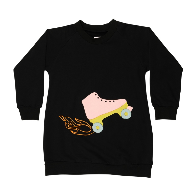 the fast freja dress from wauw capow is a cool black sweatshirt dress with a fiery pink roller skate splashed across the front. this dress has a super soft, organic brushed cotton interior, making it the perfect thing to throw on for colder days.95% organi