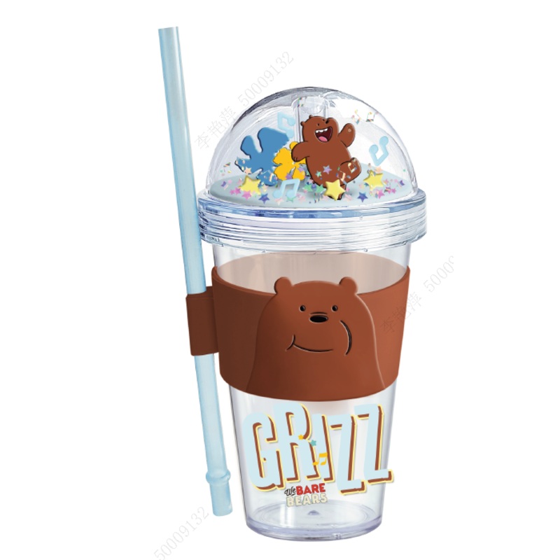 We Bare Bears Seaside Music Festival Glitter Plastic Bottle with Straw and Sleeve (420mL) (Grizz)Type: Plastic Bottle with Straw and SleeveVolume: 420mLMaterial: Durable plastic, glitter finishDesign: Features Grizz from We Bare Bears, with a festive seasi