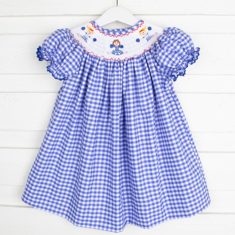 Go team!Get ready to cheer on your favorite team in style with our We Got Spirit Smocked Bishop Dress. Thischeerful outfit features three smocked cheerleaders with 3-D pom-poms on ablue gingham fabric, along with adorable bishop sleeves trimmed withblue ric-rac.