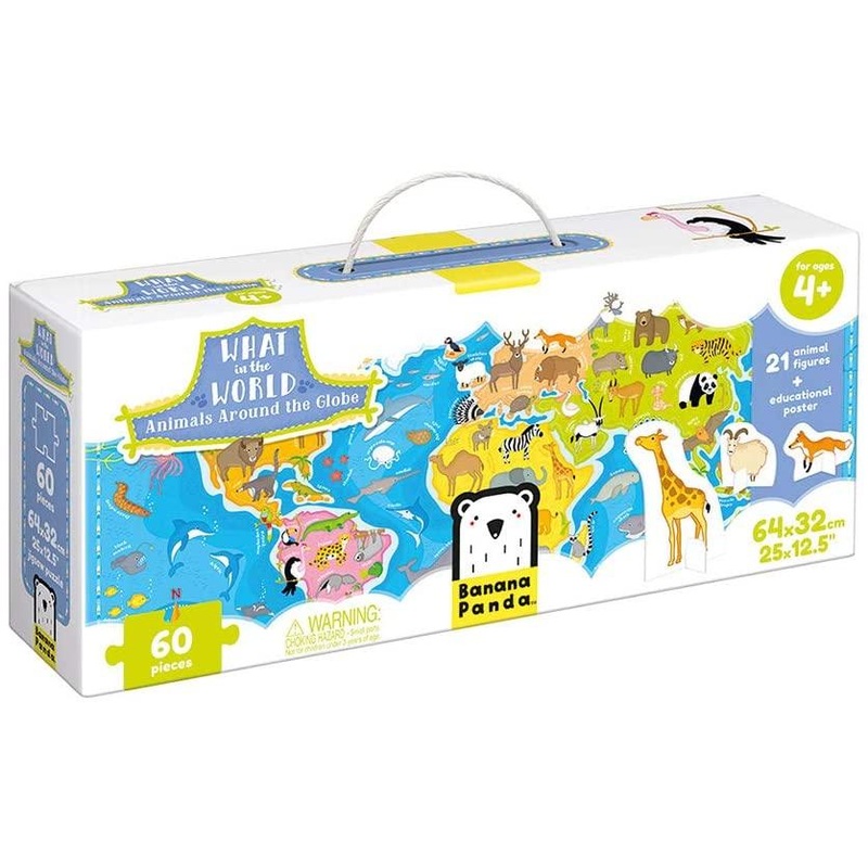 The What in the World Animals Around the Globe puzzle invites kids ages 4 and up to take a fascinating journey around the globe, featuring both well-known and exotic animals. Includes a double-sided educational poster with more interesting facts about animals, and 21 cardboard figures that are perfect for pretend play and memory training. This puzzle offers exceptional educational and play value! For ages 4 and up. WARNING: CHOKING HAZARD – Small Parts. Not for children under 3yrs.