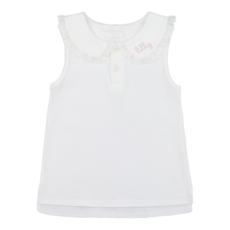 This sweet solid white sleeveless top features a classic Peter Pan collar with optional delicate embroidery for a personalized touch. Crafted from soft, breathable knit fabric, it’s perfect for warm-weather playdates, school days, or casual outings. With its button-front placket, eyelet trim and timeless silhouette, this top is a charming staple for every little girl’s wardrobe.
