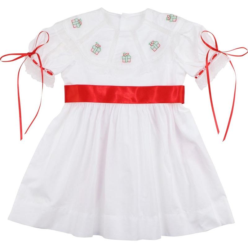 This sweet White Heirloom Embroidered Christmas Gift Satin Bow Dress features embroidered Christmas presents on the yoke, puff sleeves with red ribbon ties, and a bold red satin sash. The delicate lace trim adds a touch of charm, making it perfect for fest