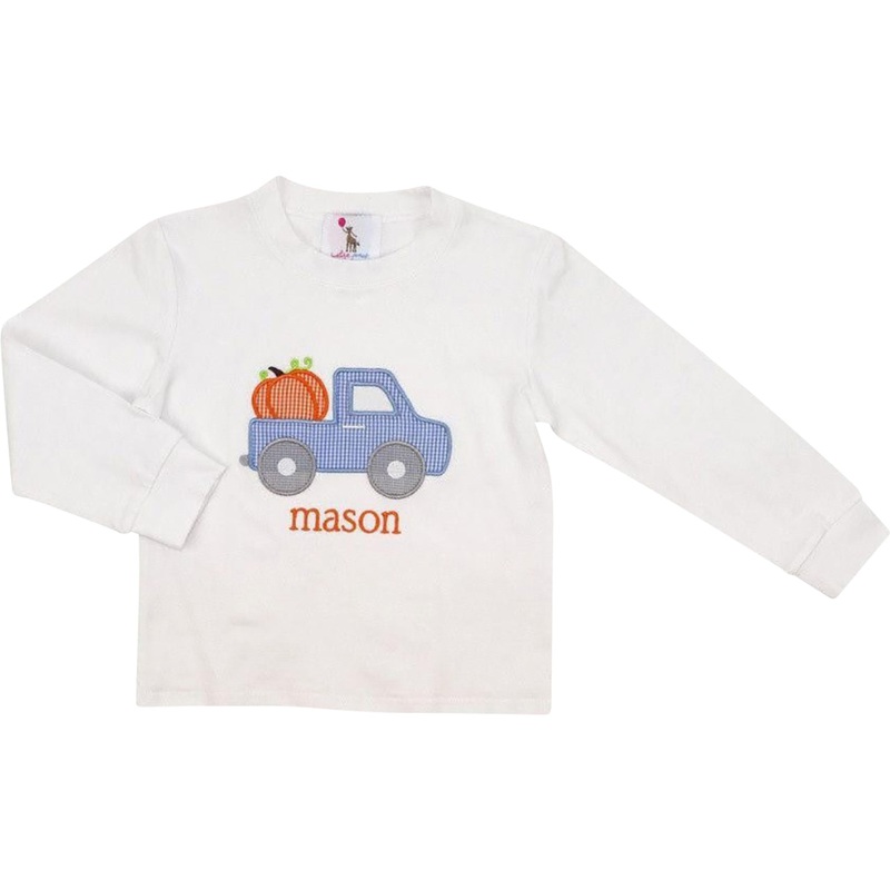 Celebrate fall in style with this festive White Knit Applique Pumpkin And Truck Shirt featuring a blue gingham truck hauling an adorable pumpkin patch. The optional personalized name in cheerful orange embroidery, adds a unique and playful touch to your li