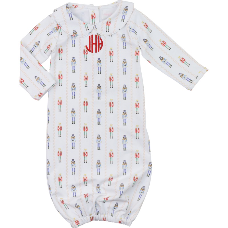This White Knit Nutcracker Print Baby Gown features a charming nutcracker print, perfect for adding classic holiday style to your little ones wardrobe. Made from soft, breathable fabric with an elastic hem, it provides cozy comfort and makes diaper changes