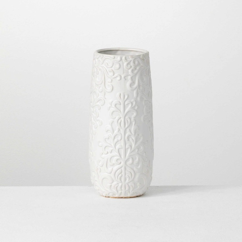Use this White Printed Vase CM2837 in many different ways to decorate your home. This vase boasts simplicity, yet features a pretty embossed scrolling detail.Dimensions: 4.5" x 11.5"CeramicDoes not have a drain hole