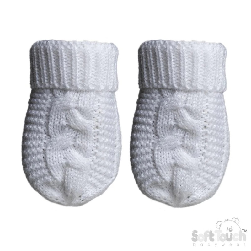 These White Recycled Baby Knit Mittens are the perfect blend of sustainability and function. Made with recycled yarn, they provide warmth and style for newborns up to 12 months. The cable knit design and turn over cuffs ensure a comfortable and snug fit.ne