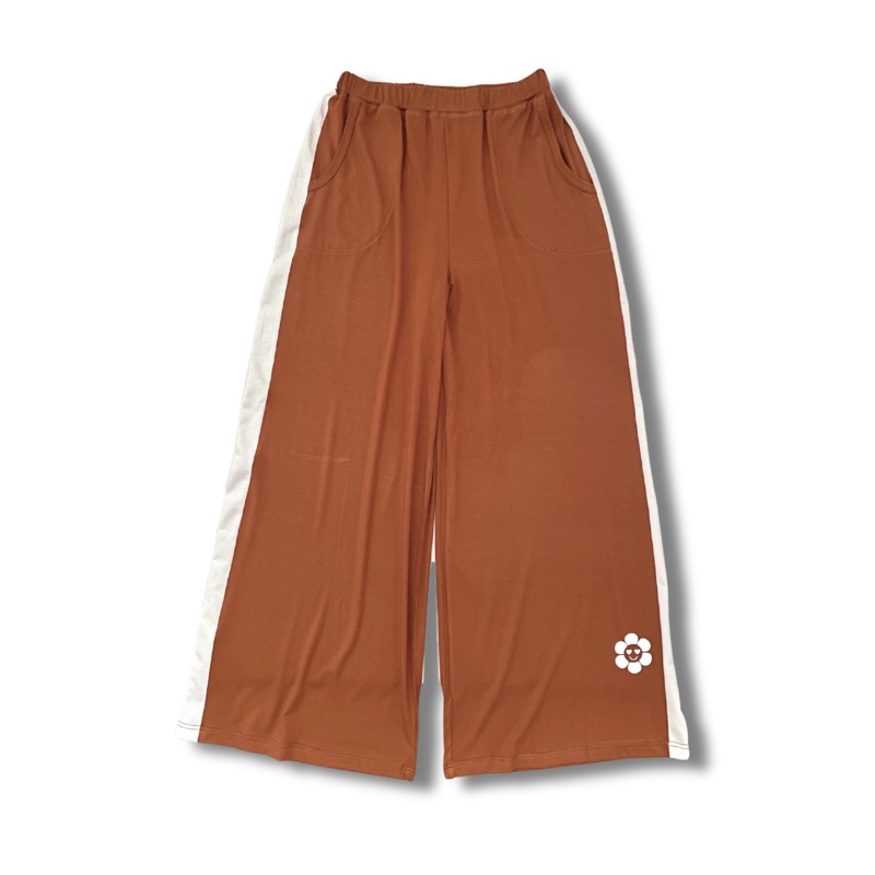 Look cool and comfortable in our elastic waist wide leg pants made from cotton/spandex jersey. The cut falls beautifully over the body and the texture feels soft and smooth. Our lounge pants feature comfortable elastic waistband, handy side pockets, contrast side stripe and out happy daisy logo.