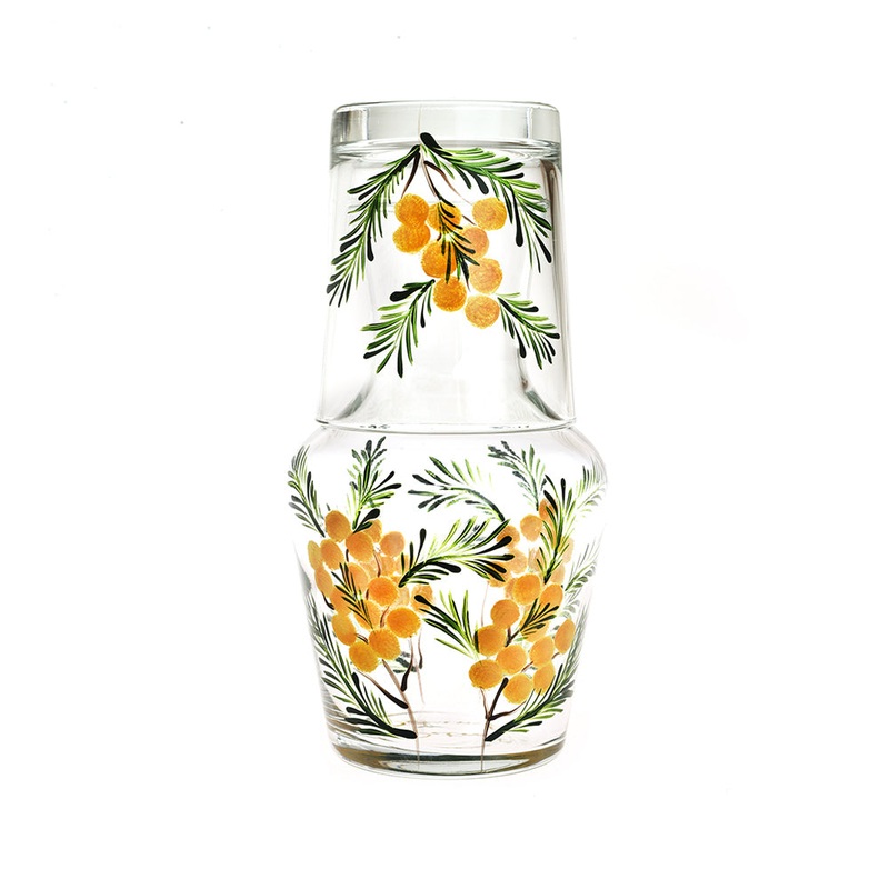 Each carafe and tumbler is handmade in France and hand-painted in the U.K. with non-toxic ink.