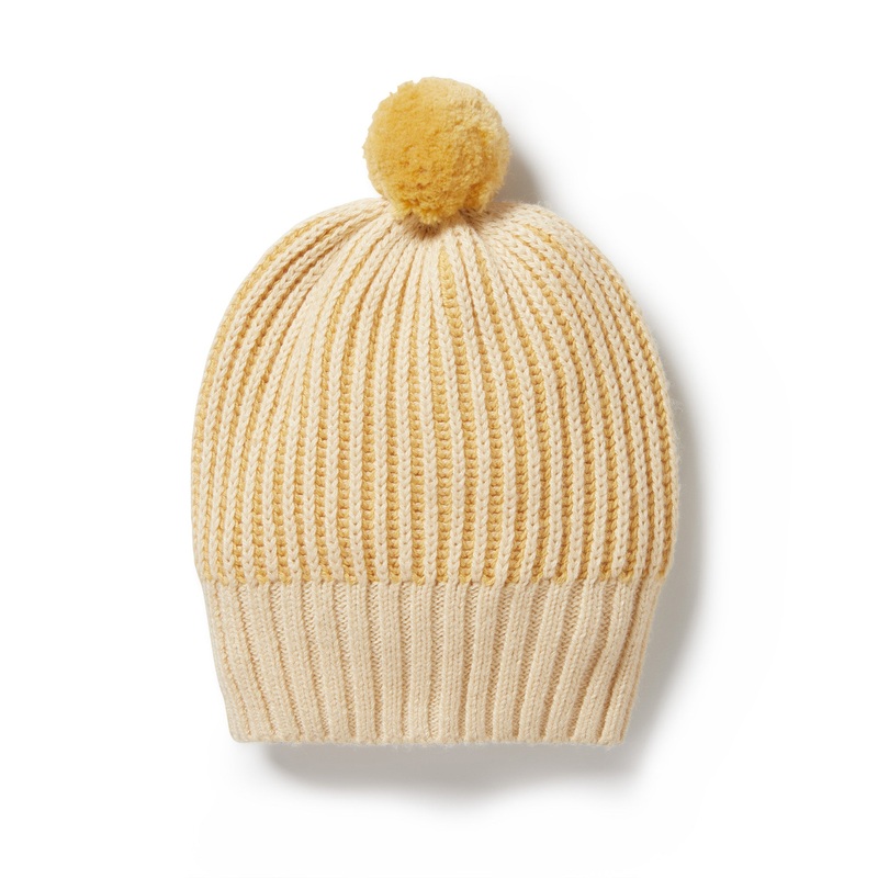 This knitted beanie with pom pom keeps your baby's head warm and stylish. Crafted from a Cotton, Bamboo and Wool blend, this cozy knit hat offers optimal warmth and softness for your little one. Perfect for completing their outfit, this hat is sure to keep