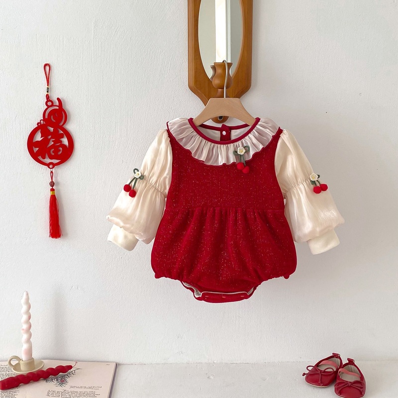 Indulge your little princess with our Winter Arrival Baby Girls Cute Cherry Attached Color Patchwork Long Sleeves Onesies. Crafted with care, this onesie features a playful cherry design and cozy long sleeves for added warmth. Perfect for your stylish bund