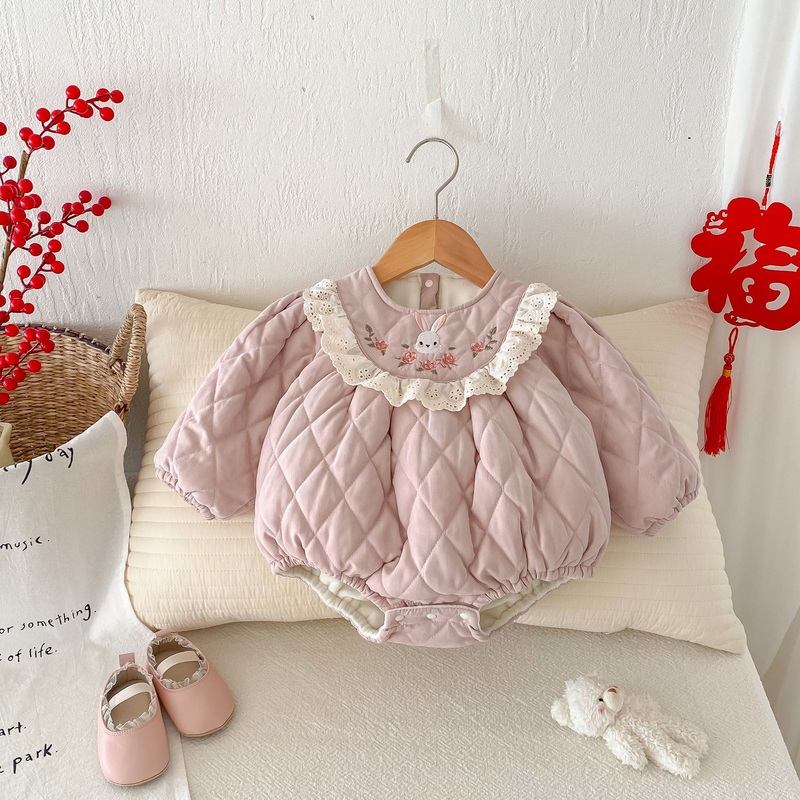 Introducing our Winter Arrival Baby Girls Onesies! Designed with an adorable embroidered rabbit pattern, these onesies are perfect for keeping your little one cozy and warm during the colder months. Made with a thick padding, they provide maximum comfort a